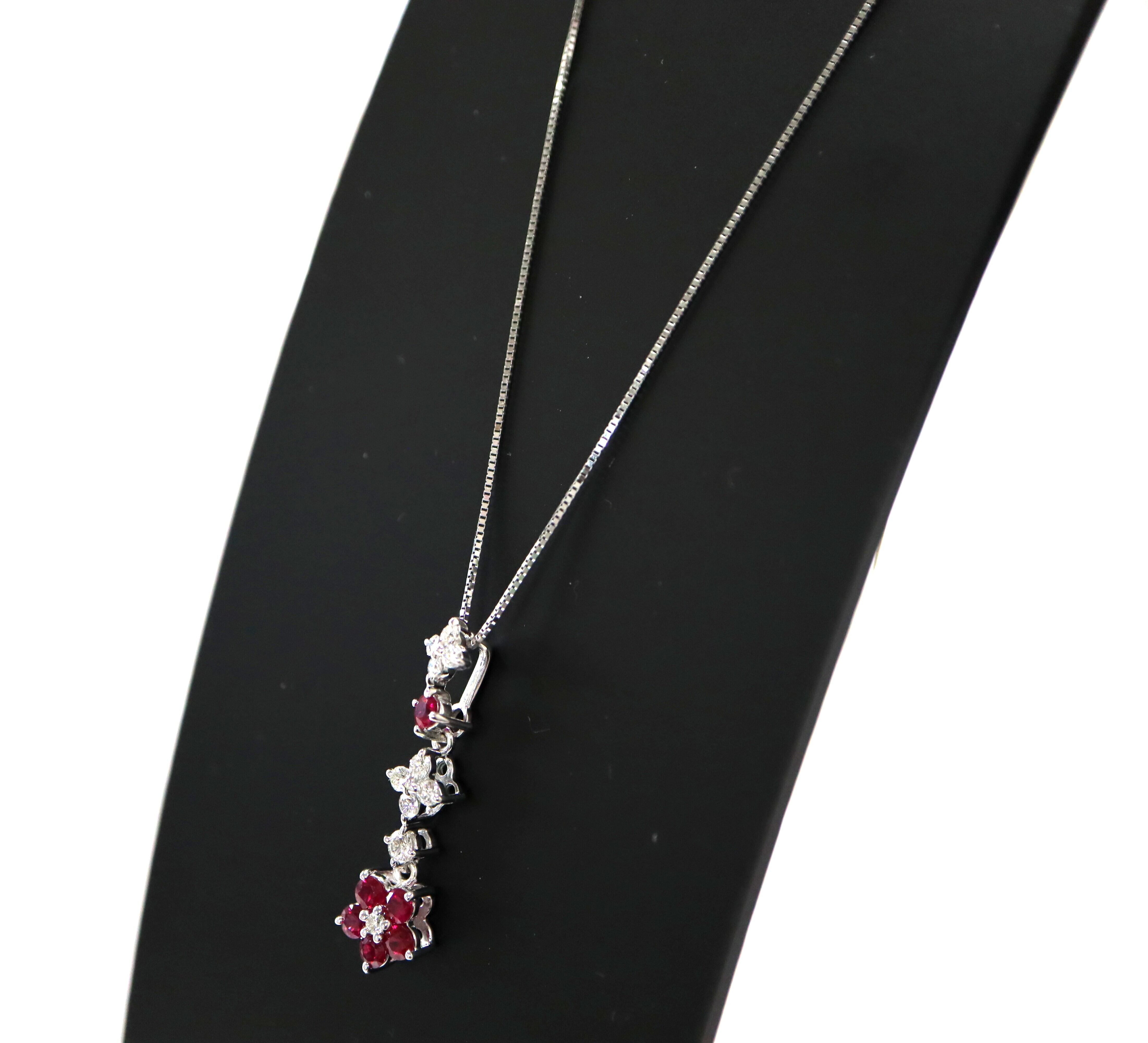 K18ホワイトゴールドを使用した繊細なチェーンに、ルビーとダイヤモンドを組み合わせた美しいフラワーモチーフのペンダントが揺れるデザイン。
